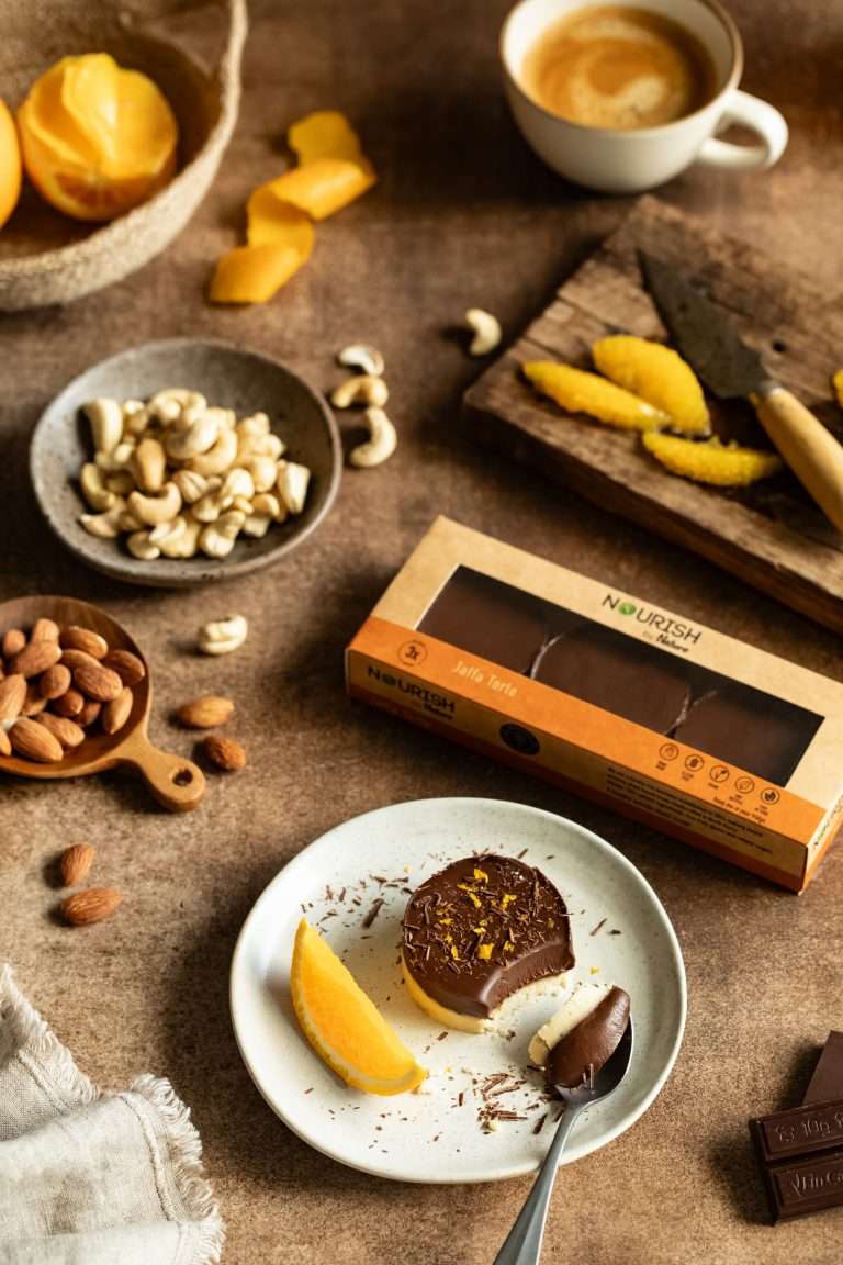 Orange infused cashew base topped with a rich orange chocolate ganache. Ingredients: Gluten free oats, CASHEWS, ALMONDS, coconut milk, dark chocolate, coconut oil, maple syrup, orange rind Allergen information: Contains NUTS (Cashews & Almonds)